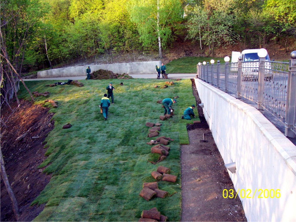 Раскатайте рулоны готового газона так, чтобы их края соприкасались друг с другом. Наложение краев лент газона или свободное пространство между ними недопустимо. Бороздки между лентами газона заполните такой же или связывающей почвой. Чтобы разровнять образовавшиеся бугорки и неровности после укладки готового газона, слегка прикатайте поверхность катком. В жаркую и сухую погоду в течение первых нескольких недель газон необходимо обильно поливать. Лучшее время для полива – раннее утро и поздний вечер, т.е. время, когда солнце наименее активно.